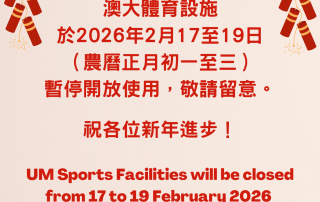 澳大體育設施在農曆新年公眾假期期間關閉 (2026年2月17至19日)