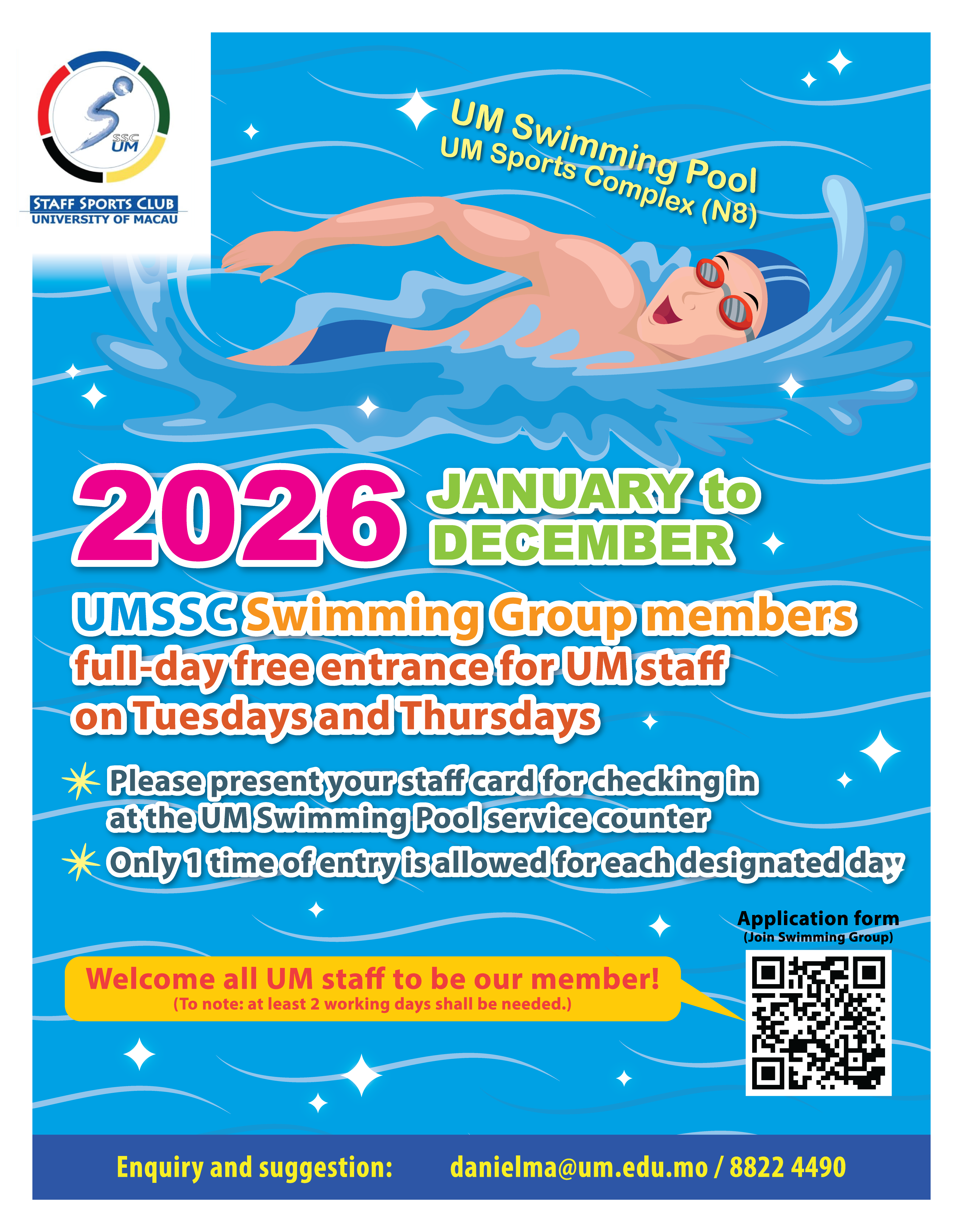 澳大教職員體育會游泳組組員可免費使用澳大游泳館(2026年1至12月期間每週二、四全天)