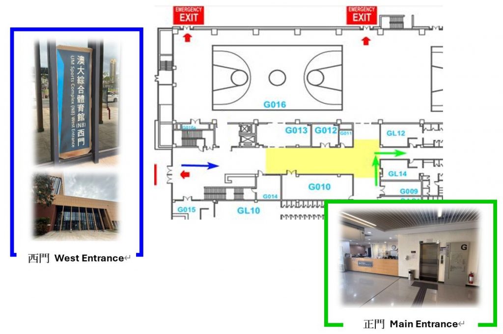 For users who want to access the Swimming Pool (G015), Training Hall (G016 & G028), or the 1st to 4th Floor of N8, please access via the West Entrance and follow the on-site signage at the lobby (Blue arrow). Alternatively, users may use the lift at the Main Entrance Counter to reach the 1st Floor of N8, and proceed to the said areas.